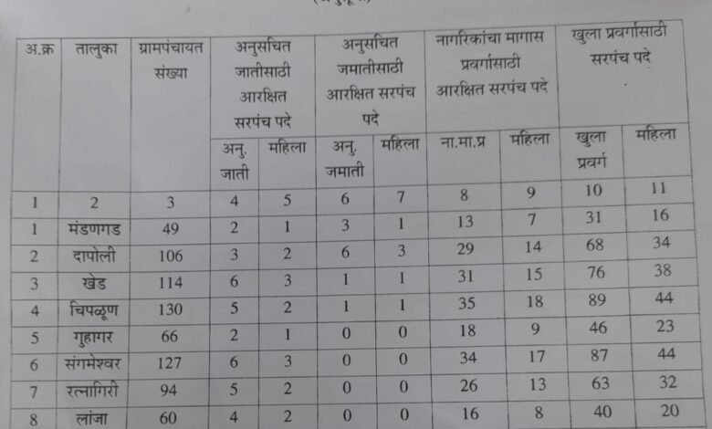 रत्नागिरी : जिल्ह्याकरिता तालुकानिहाय सरपंच पदाचे आरक्षण निश्चित करण्यात आलेले असून महाराष्ट्र ग्रामपंचायत (सरपंच व उपसरपंच) निवडणूक नियम, 1964 मधील नियम 3(अ) (ब) व 4 प्रमाणे जिल्हाधिकारी एम. देवेंदर सिंह यांनी जिल्ह्यातील तालुकानिहाय सरपंचांची पदे वेगवेगळ्या प्रवर्गासाठी आणि महिलासाठी पुढील पाच वर्षाकरिता (सन 2025 ते 2030 या कालावधीत गठीत होणाऱ्या ग्रामपंचायतीकरिता) आरक्षित करुन, सरपंच पदाची संख्या निश्चित केली आहे.