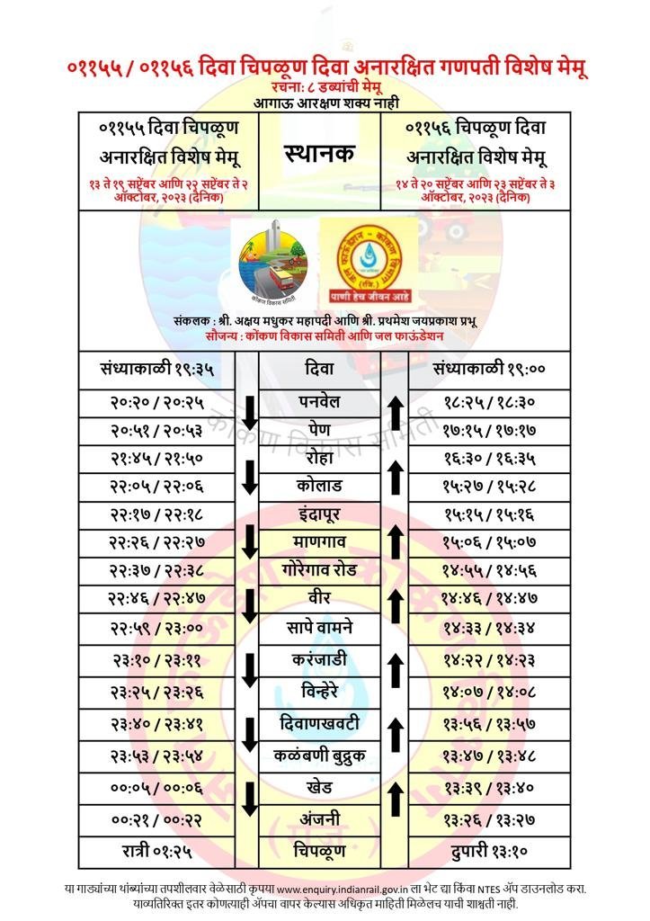 गणेशोत्सवात कोकण रेल्वे मार्गावरील सर्वच गाड्यांना गर्दी होत असल्यामुळे मुंबई तुमचे पण पर्यंत येणाऱ्या प्रवाशांच्या सोयीसाठी मागील काही वर्षांपासून चिपळूणसाठी स्वतंत्र लोकल श्रेणीतील रेल्वे गाडी सोडण्यात येते. याही वर्षी दिनांक 13 सप्टेंबर पासून चिपळूणसाठी दिवा ते चिपळूण अशी मेमू ट्रेन सोडली जाणार आहे. दिवा ते चिपळूण मेमू गाडीची दिवा जंक्शन येथून सुटण्याची वेळ सायंकाळी 7:45 अशी होती. मात्र आता सुधारित वेळापत्रकानुसार ही गाडी(01155) दिवा जंक्शन येथून दहा मिनिटे आधी म्हणजे सायंकाळी ७ वाजून ३५ मिनिटांनी सुटणार आहे.
